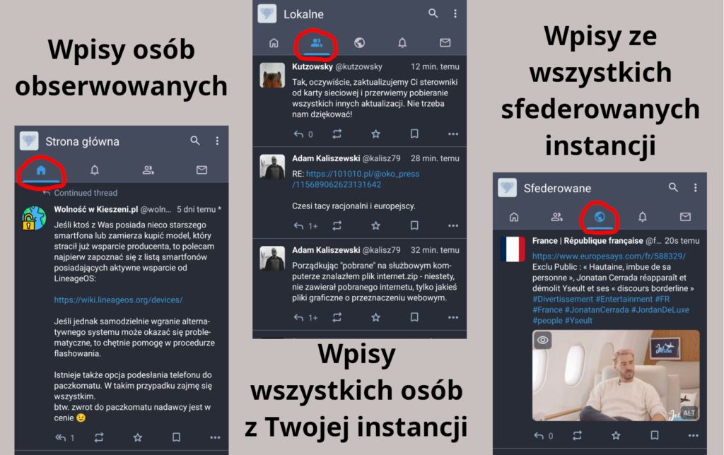 Na pierwszy rzut oka korzystanie z Mastodona może wydawać się nieco trudniejsze w porównaniu do twixera. Wszystko staje się jednak jaśniejsze, jak tylko zrozumiemy istotę federacji. W pewnym uproszczeniu nasz Mastodon składa się z trzech głównych kart: