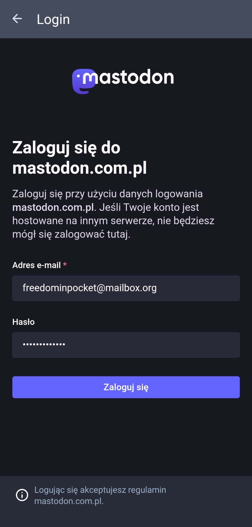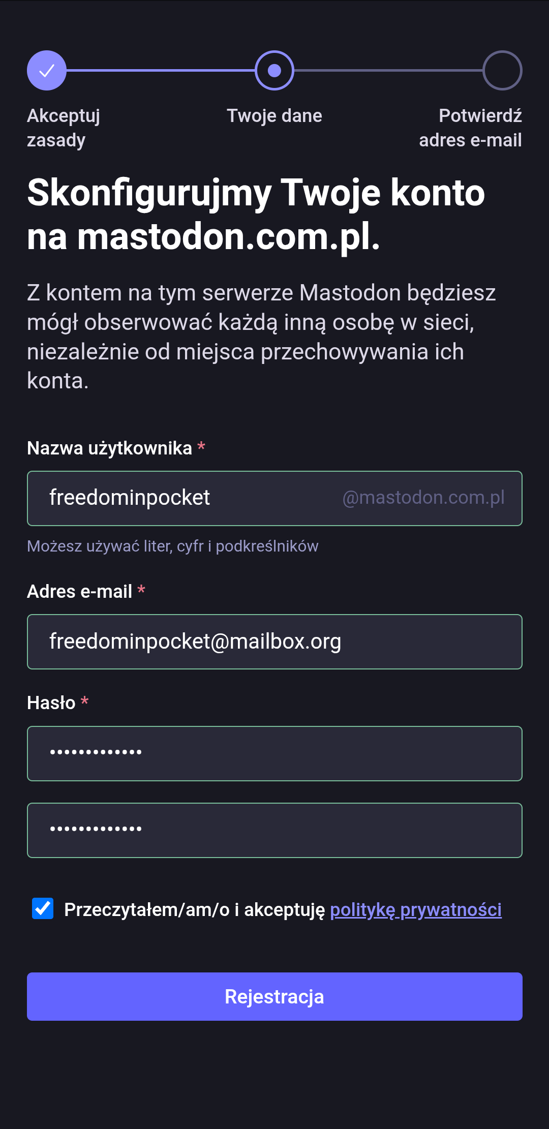 Żeby zarejestrować się na danej instancji otwieramy przeglądarkę, wchodzimy na jedną z nich, np. mastodon.com.pl (link z zaproszeniem) i tapiemy Załóż konto. Pierwszym krokiem jest przeczytanie regulaminu – czytamy, przewijamy i akceptujemy. Następnie wpisujemy naszą nazwę użytkownika. Można porównać ją do pierwszego członu naszego adresu email. Raz wybranej nazwy nie można już zmienić. Na potrzeby tego wpisu wybraliśmy nazwę freedominpocket, czyli nasza pełna nazwa użytkownika będzie wyglądała następująco: freedominpocket@mastodon.com.pl. Następnie podajemy nasz adres email, oraz wpisujemy hasło. Na koniec tapiemy Rejestracja i oczekujemy na maila z linkiem potwierdzającym założenie naszego konta.