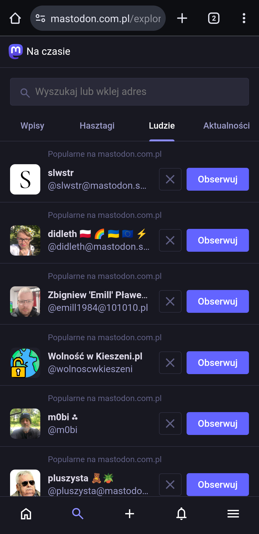 Na tym moglibyśmy skończyć proces zakładania nowego konta, jednak warto byłoby na początek zaobserwować kilka interesujących osób. Możemy to zrobić na dwa sposoby: Po prostu przewijamy wpisy, a poniżej zobaczymy sekcję Kogo warto obserwować. Drugi sposób to otwarcie menu (hamburger), następnie wybór podmenu Na czasie, a w nim zakładkę Ludzie. Znajdziemy tutaj proponowane konta do obserwowania opisane jako popularne na mastodon.com.pl.