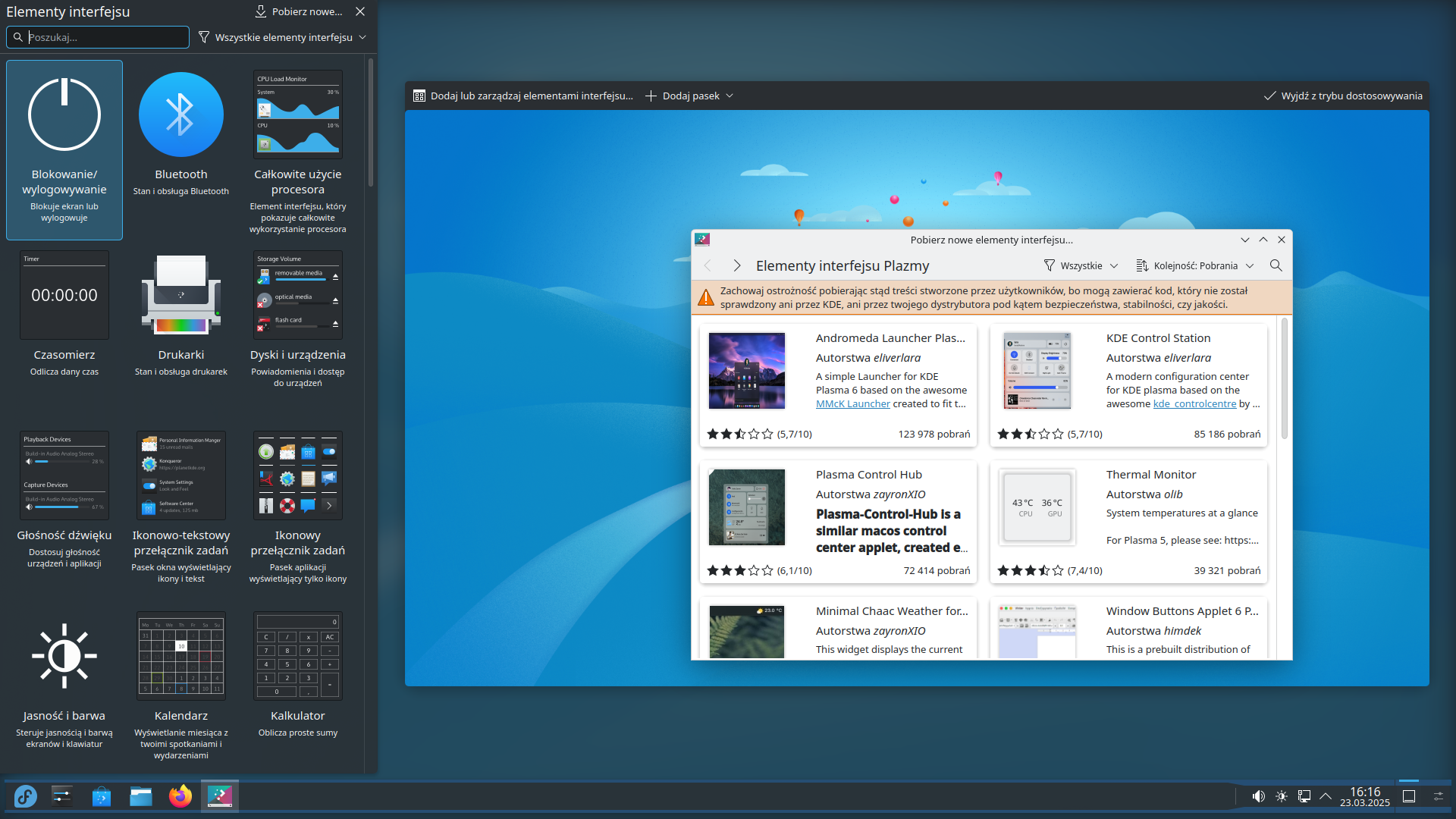 Do obsługi zarządzania pakietami służy nam Pacman tak jak w Archu, zaś do graficznej – Pamac, autorskie rozwiązanie deweloperów tejże dystrybucji. To w nim instalujemy oprogramowanie, aktualizujemy system i możemy włączyć obsługę AUR. Dlaczego nie jest ona włączona domyślnie? Użytkowanie repo AUR może wiązać się z ryzykiem niestabilności, gdyż jest to repozytorium pochodzące bezpośrednio z Archa (nie jest testowane przez developerów Manjaro) i odpowiedzialni są za nie użytkownicy a nie developerzy dystrybucji. Należy być tego świadomym korzystając z niego. Nie mniej dystrybucja ta z powodzeniem nadaje się do codziennego użytkowania. Manjaro występuje domyślnie ze środowiskiem graficznym KDE Plasma.