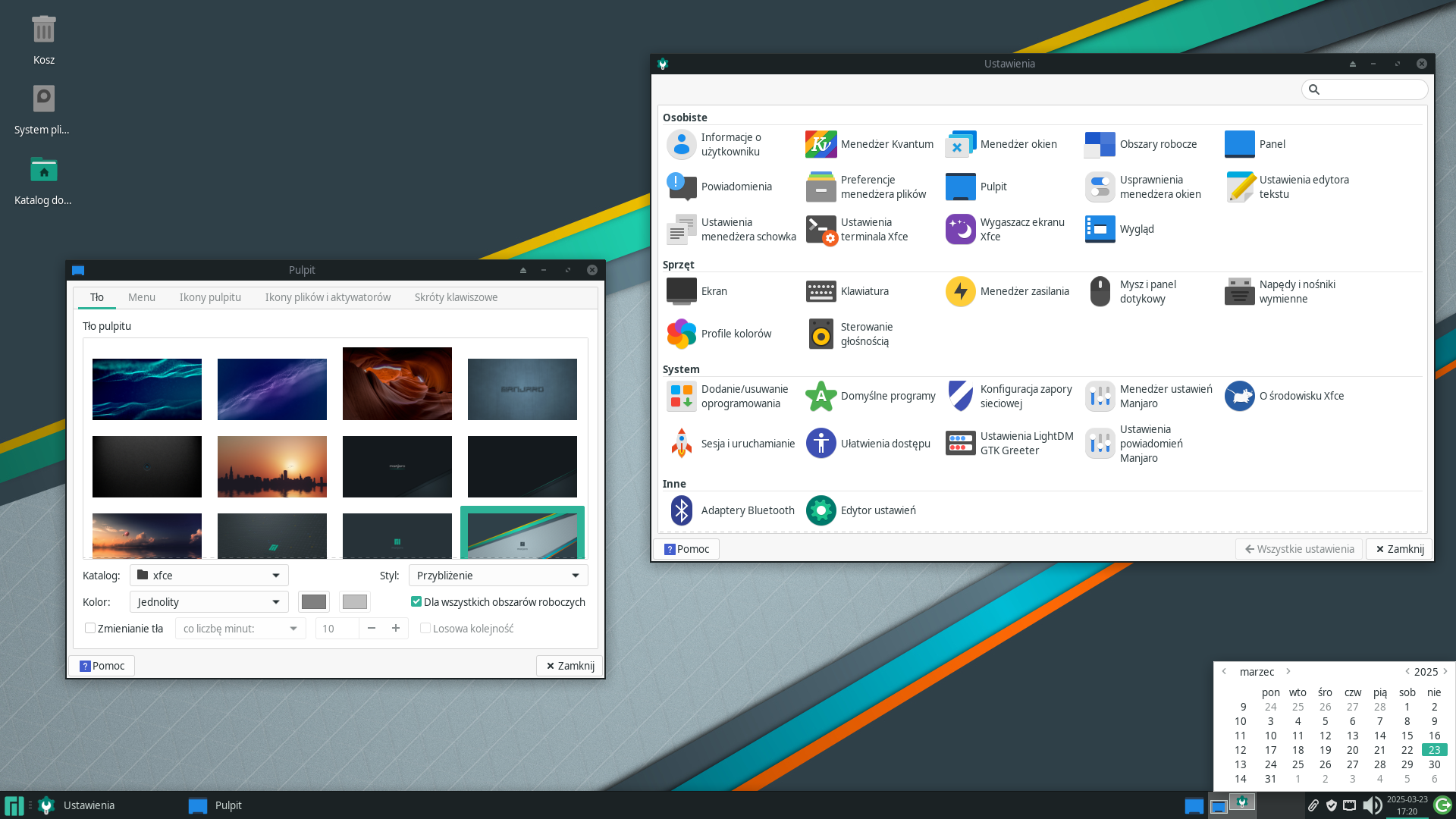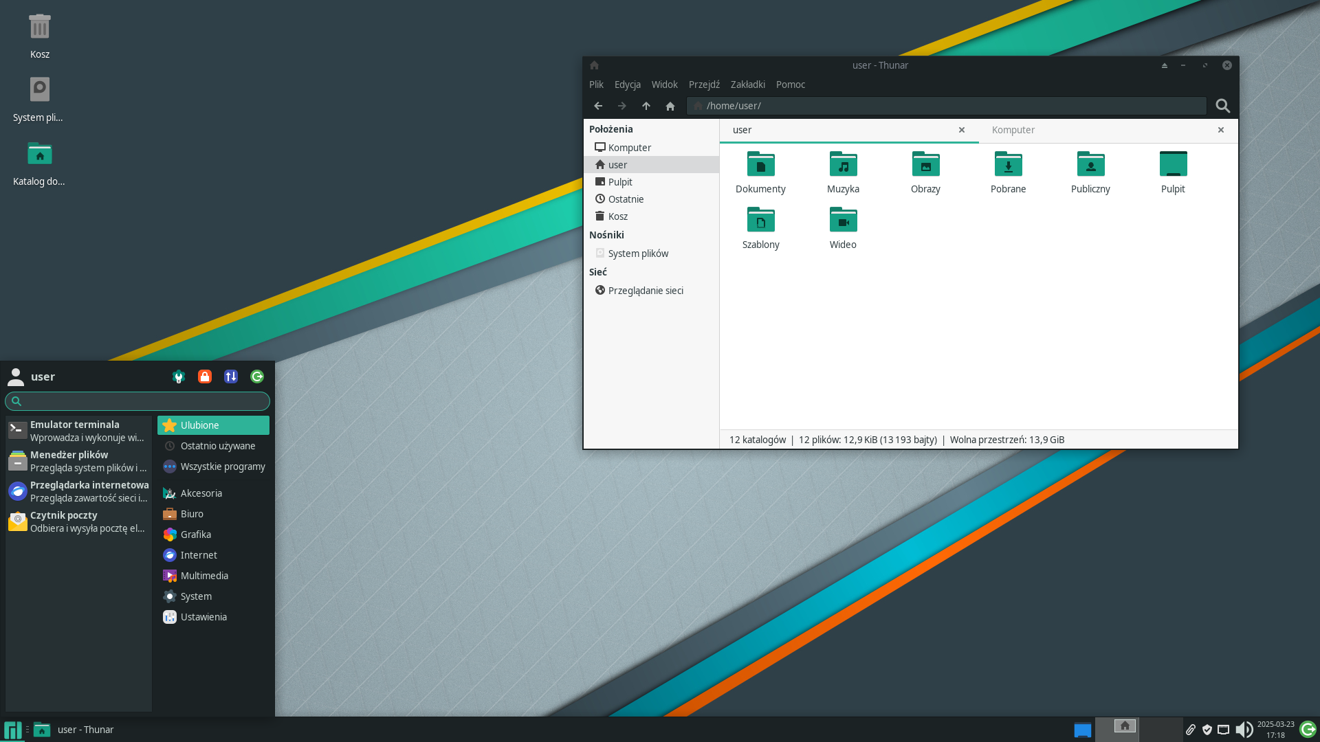 Trzecie środowisko w naszym zestawieniu to XFCE. Dla odmiany w porównaniu do poprzedników jest to jedno z najlżejszych środowisk graficznych. Polecane szczególnie do używania na słabszych sprzętach. Nie posiada ono zbyt wielu opcji konfiguracyjnych, jednak jest w pełni funkcjonalne oraz posiada podstawowy zestaw aplikacji. Jego zaletą jest łatwość obsługi i wspomniana wcześniej wydajność. Wadą zaś może być nieco mało nowoczesny wygląd oraz brak bajerów wizualnych. XFCE jest naprawdę szybki, nawet w środowisku wirtualnym reaguje natychmiastowo.