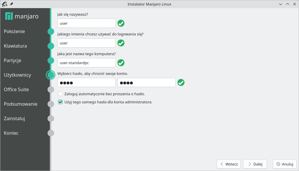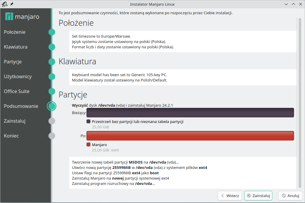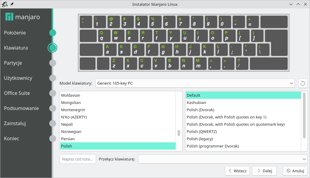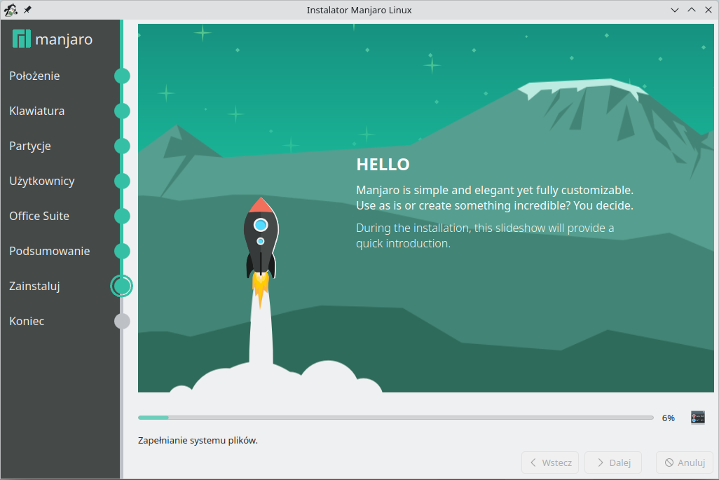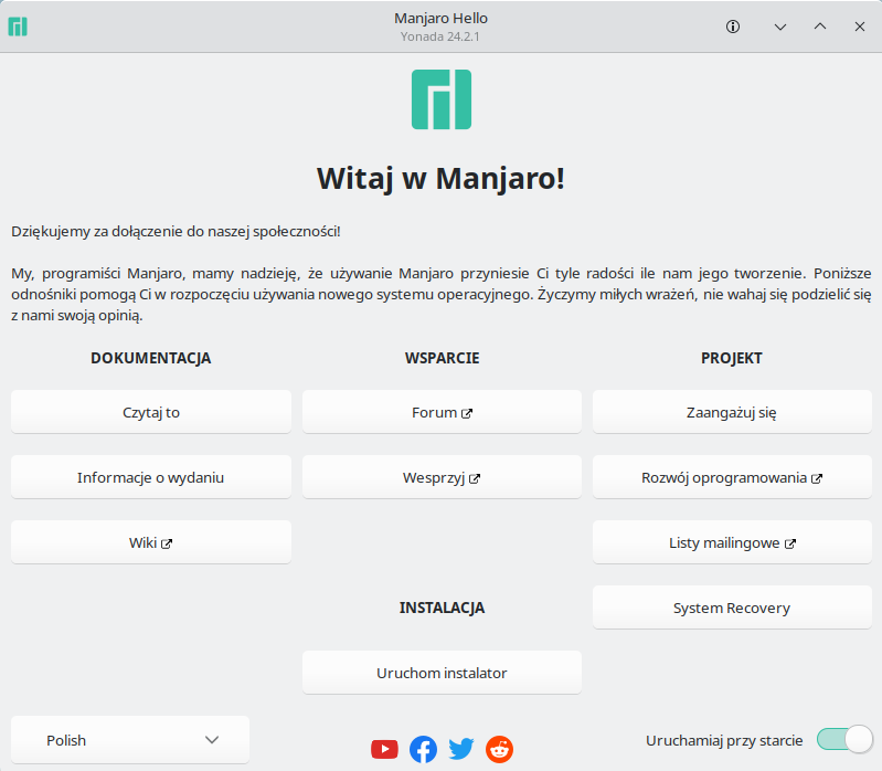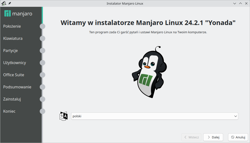 • Wciskamy Enter, załaduje nam się pulpit systemu Manjaro w wersji Live z oknem powitalnym (1 screen). Wybieramy język polski i klikamy uruchom instalator. Reszta instalacji jest banalnie prosta, cały proces przedstawiają poniższe zrzuty ekranu.